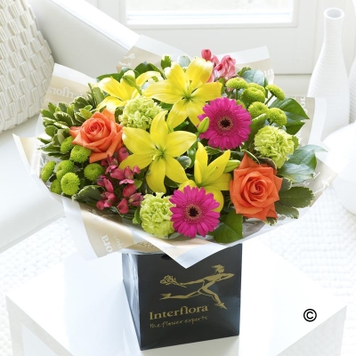 Someone is going to love this gift. The kaleidoscope of radiant colour ensures this striking hand-tied takes centre stage right away. With roses, lilies, carnations, chrysanthemums and so much more, this is certainly the right choice of gift to make an impression.