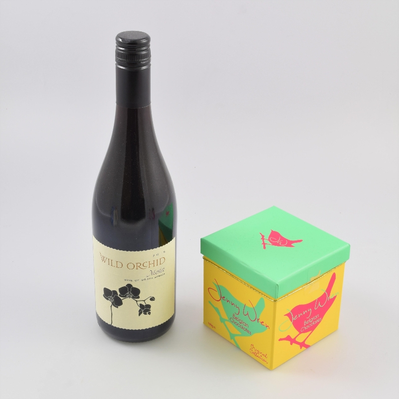 This gift includes a bottle of Wild Orchid Merlot and a box of Belgian chocolates.