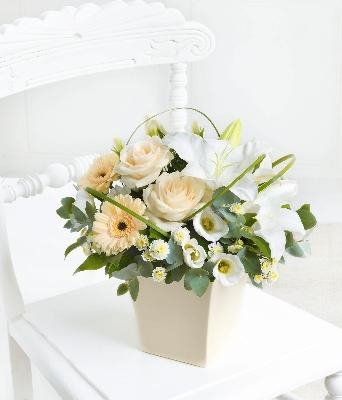 Combines timeless beauty and elegant simplicity. Contains exquisite white roses, graceful lilies and a beautiful selection of germini and lisianthus with the looped bear grass to add a contemporary twist.