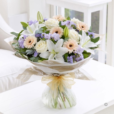 Sophistication, beauty and understated elegance; this exquisite bouquet really has it all. There is so much to savour, including the exotic beauty of lilies, the delicate scent of freesias and the softest shades of lilac, peach and cream.