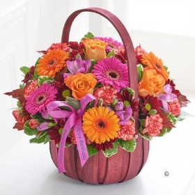 This colourful floral basket is a charming way to send your birthday wishes to someone special. A carefully arranged selection of fresh blooms in glorious orange, red and pink shades are all beautifully presented in a wooden basket. They’ll definitely put it in pride of place!