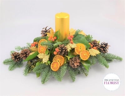 Made with spruce and decorated with pine cones, dried orange slices, gold holly leaves and frosty red-orange berries, this arrangement will make a warm, festive table centre for Christmas. It is available in classic, premium in luxury sizes with one, two and three candles, respectively.
