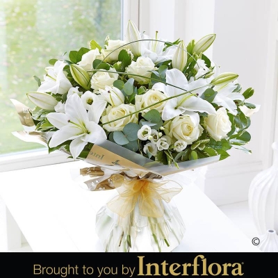 This is a very elegant, contemporary hand-tied bouquet. Groups of crisp white flowers are beautifully framed by loops of steel grass. It’s simple in colour, but intricate in design, and the lilies give a sweet scent to the bouquet.