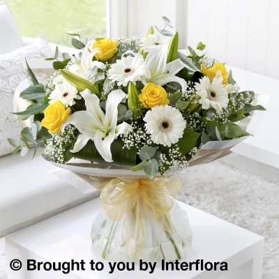 This stunning hand-tied arrangement will bring the sunshine to any home. It includes, white germini, Oriental liles and gypsophila combined with yellow roses. These are combined with aspidistra leaves and other foliage to make a beautiful gift.