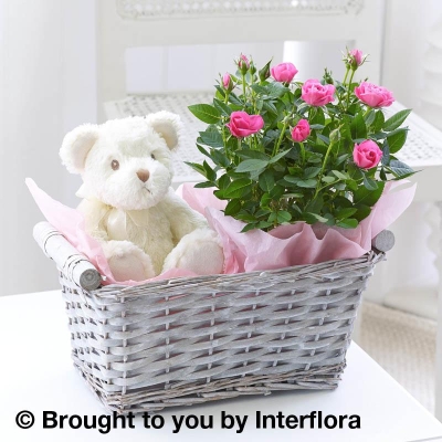 A thoughtful gift to celebrate the arrival of a new baby girl, this pretty grey wash gift basket has something for everyone. There's a beautiful pink miniature rose plant to display and enjoy, which can also be planted into the garden, and a snuggly white teddy bear for baby as well.