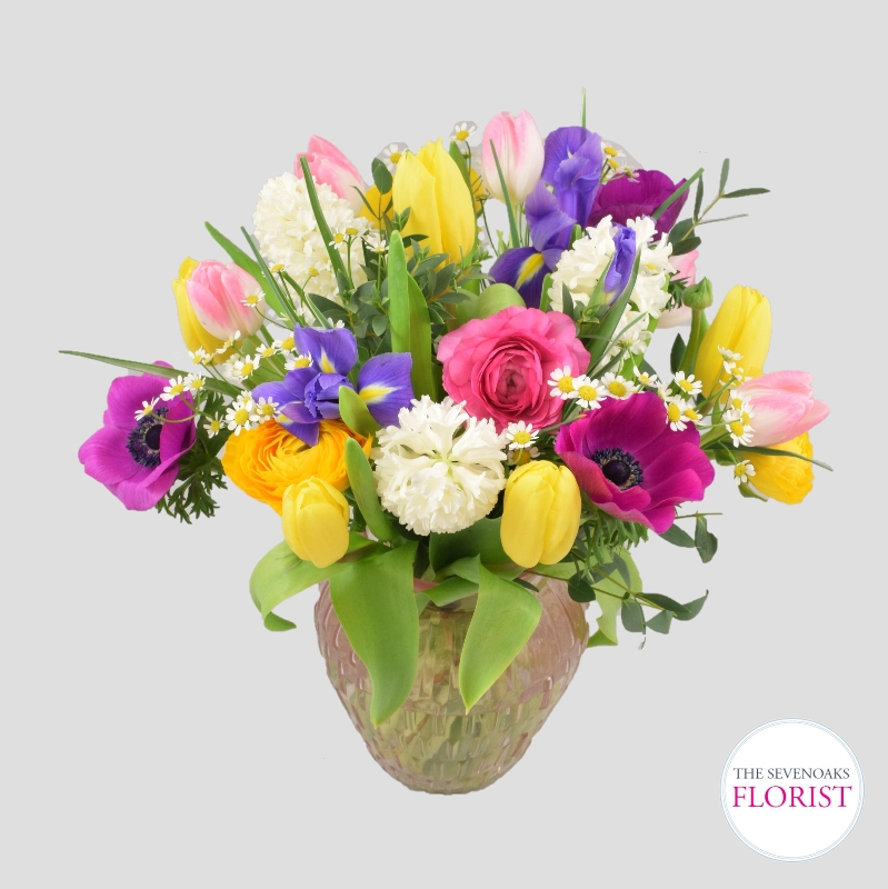 This vase of spring flowers will bring colour and fragrance into any room. The types of flowers likely to be included are tulips, ranunculus, hyacinth, anemones and iris, all arranged with tanacetum and foliage in a glass vase. The vase used may vary from the one shown.
