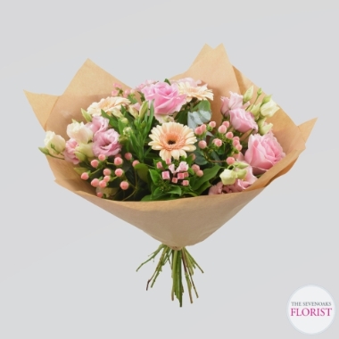 Bringing together the prettiest of pink and delicate peach tones, this femine bouquet makes a beautiful gift. It contains pale pink roses, hypericum, alstroemeria and lisianthus, arranged with peach germini and foliage.