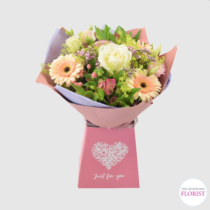 We’ll deliver a bouquet of the finest, seasonal flowers, once a month for 3, 6, 9 or 12 months. Each bouquet comes in water and sits in an open top gift box, as shown.
